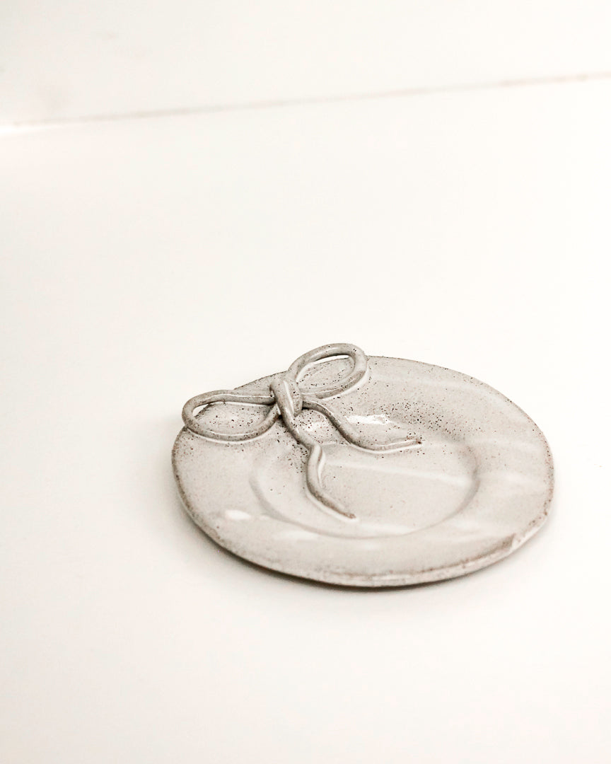 Hand built and glazed by hand, each plate carries subtle variations that make it uniquely yours. A delicate bow rests on the edge, quietly marking it as a piece made with care.